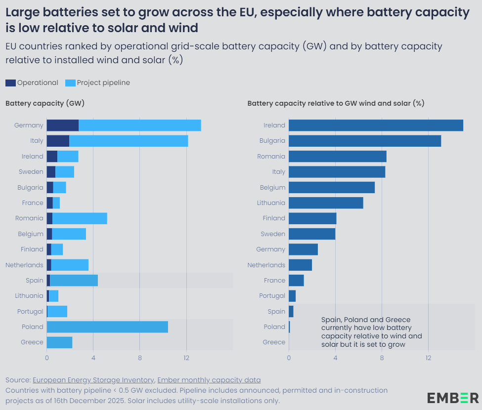 Boom des batteries en Europe : L’étude met en évidence les premiers effets positifs du déploiement rapide des batteries sur le continent. Si près de la moitié des capacités de batteries à l’échelle du réseau de l’Union européenne restent concentrées dans deux pays seulement — l’Italie et l’Allemagne — l’année 2025 a été marquée par des signes clairs d’accélération dans l’ensemble du bloc. Des projets de batteries ont ainsi été lancés ou annoncés dans la plupart des États membres.