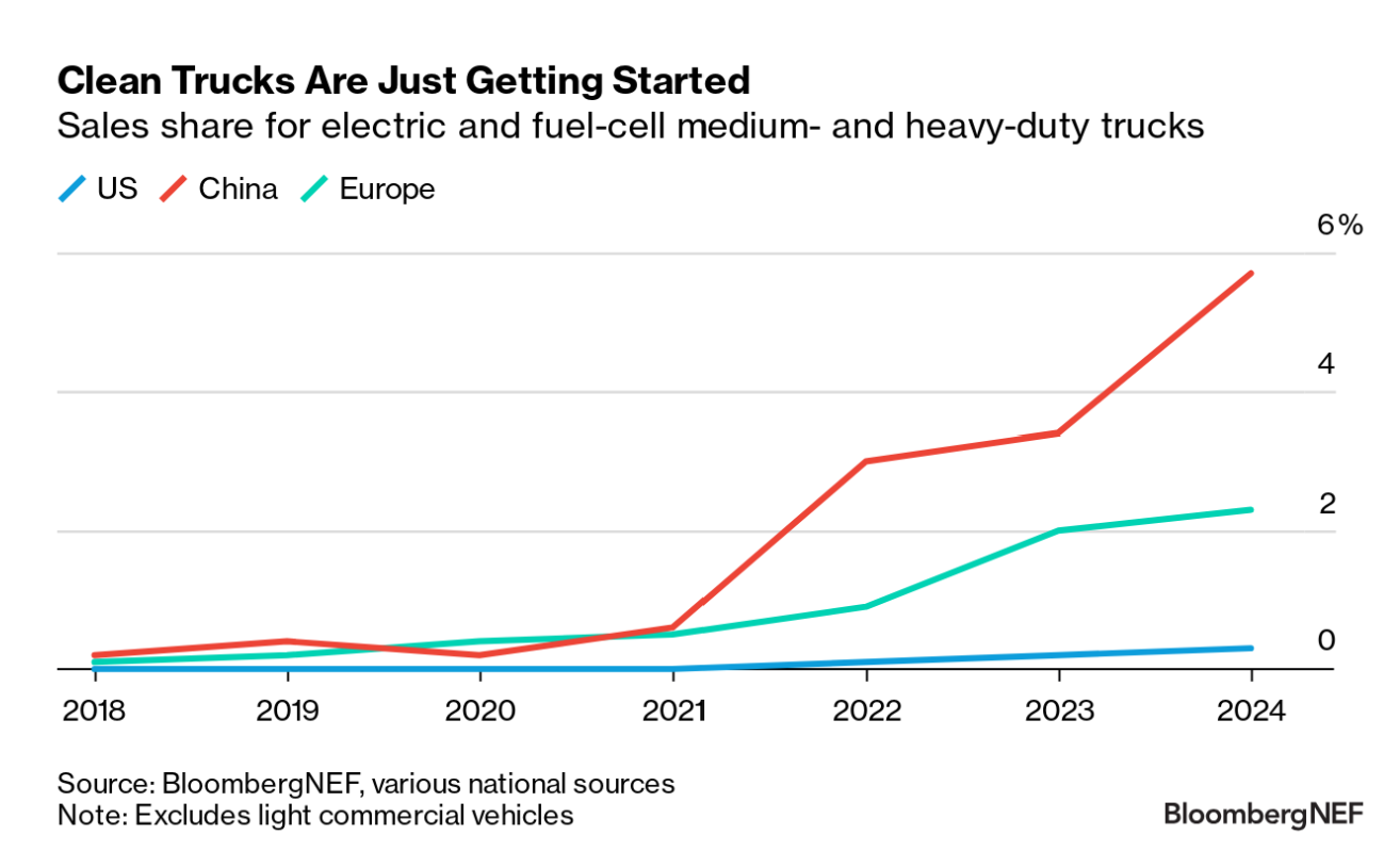 L’autre évolution essentielle du marché représente un changement de paradigme entre le camion électrique et celui roulant avec une pile à combustible (hydrogène). Les ventes en berne de leur version à hydrogène ont poussé les grands constructeurs à appuyer sur la pédale de frein. « La grande majorité des poids lourds propres vendus sont électriques, les camions à pile à combustible n'occupant qu'une petite partie du marché. Il est encore tôt, mais les groupes motopropulseurs électriques ont déjà pris une avance considérable dans la course », indiquent les analystes de BNEF.