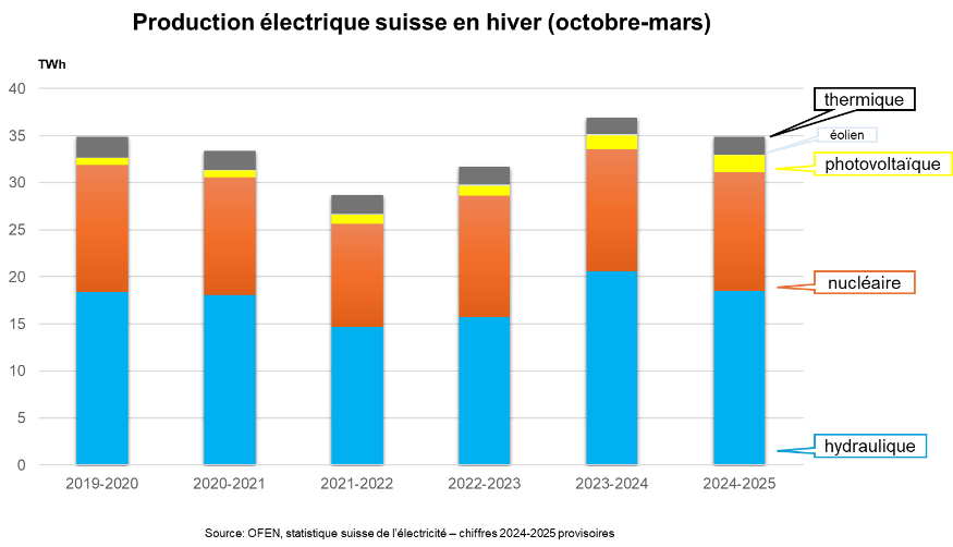Parmi les différentes énergies renouvelables, c’est surtout l’énergie hydraulique qui permet de produire de l’électricité de manière fiable en hiver. Mais elle atteint ses limites. Au vu de la trajectoire actuelle, sa contribution ne suffira pas à maintenir une production hivernale stable, et encore moins à compenser la hausse de la consommation induite par la multiplication des pompes à chaleur, des véhicules électriques ou par l’augmentation de la prospérité.